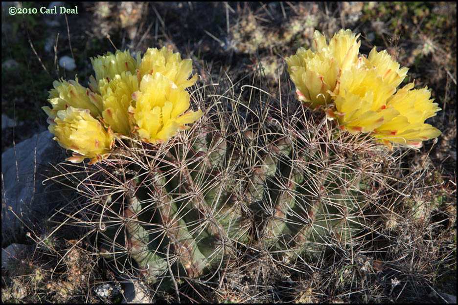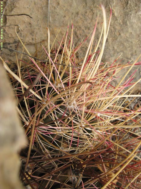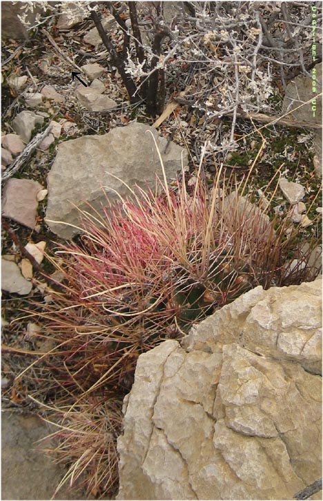 growing behind and to the left of a large Ferocactus hamatacanthus?