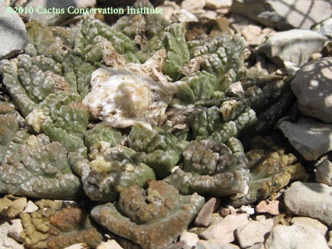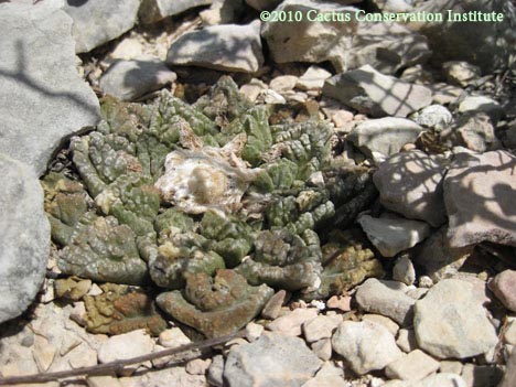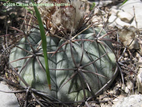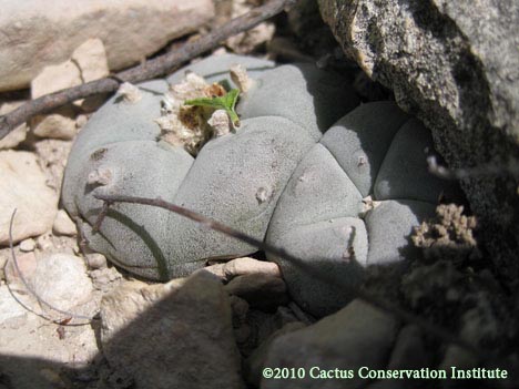 This first photo captured what is thusfar the only instance in which we have encountered Ariocarpus fissuratus (1), Echinocactus horizonthalonius (3) & Lophophora williamsii var. echinata (2) growing as neighbors. Also present are Acacia berlandieri (5), Lippia graveolens (4) and Heliotropium torreyi (6).