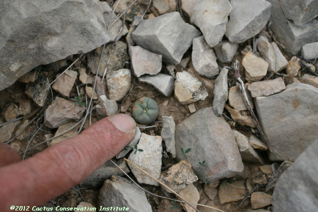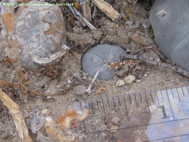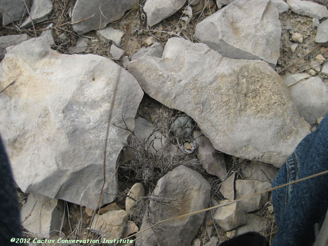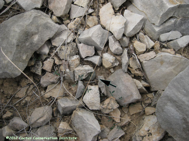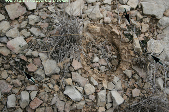 Cavity in the lower right-hand image above once housed an Ariocarpus fissuratus until it died following extreme cold and drought. Young Mammillaria lasiacantha and Mammillaria heyderi Terrell Co