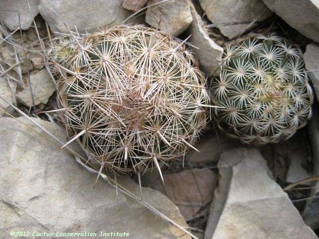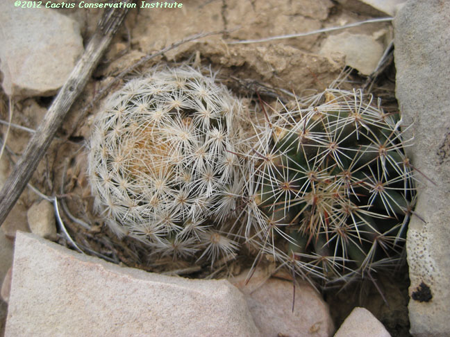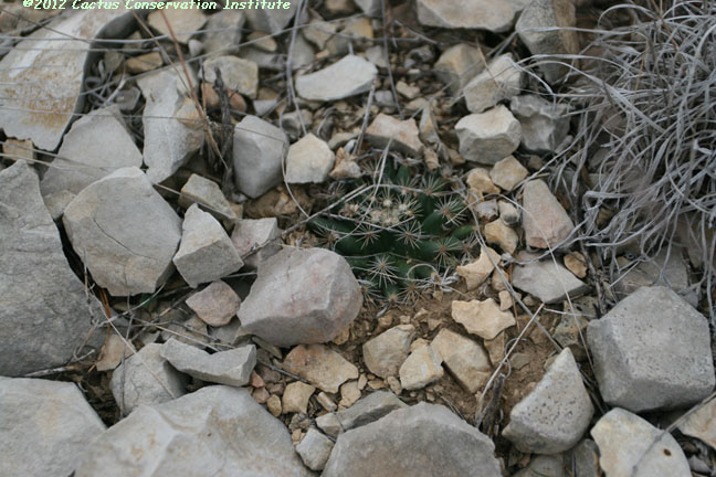For a better sense of scale, notice that this is growing with a Prosopis. Coryphantha echinus Terrell Co